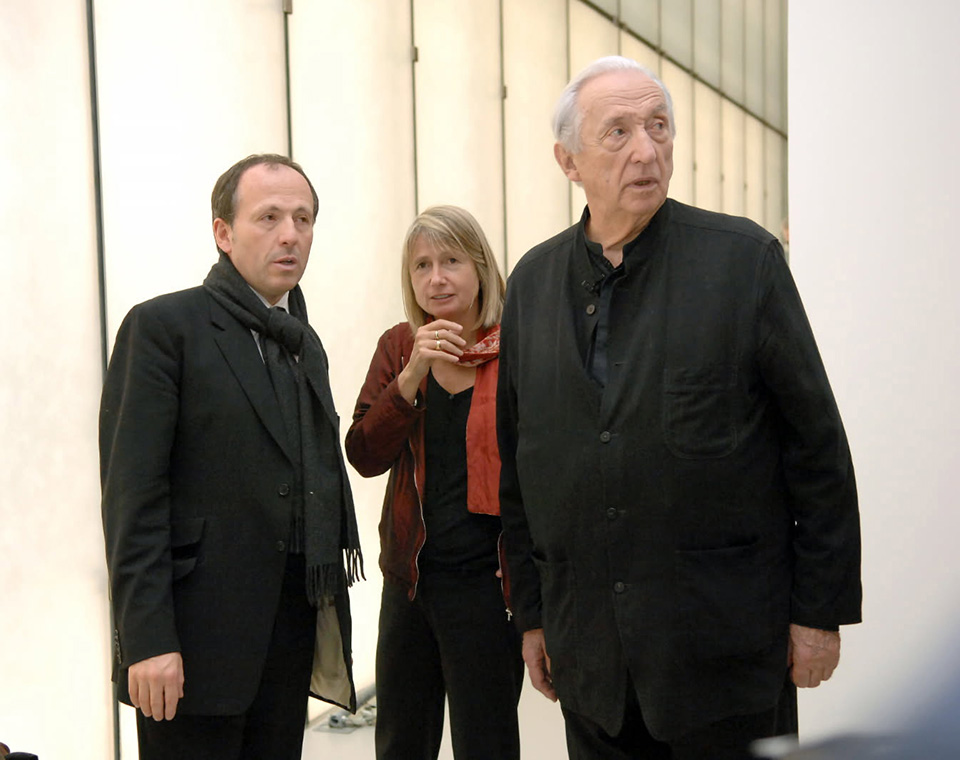 Michel Hilaire et Pierre Soulages dans la grande salle vitrée n° 47, lors de l’inauguration du nouveau musée Fabre, en 2007, avec Laurence Laval, du cabinet d’architecte Brochet & Nebout. © C. Marson/Montpellier3M