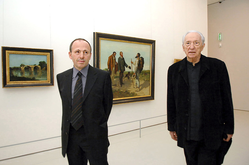 Le peintre Pierre Soulages en compagnie de Michel Hilaire, en 2006, devant le tableau de Gustave Courbet, Bonjour Monsieur Courbet, initialement intitulé La Rencontre. © C. Marson/Montpellier3M