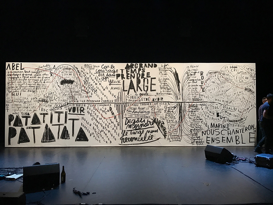 Bonnefrite vient d’ailleurs de créer, pour le magazine Le 1 hebdo une couverture et une affiche reprenant la liste des mots bannis par Trump. En mai 2025, il a reçu le premier prix de l’Académie des Beaux-Arts du 31e festival du signe, centre national du graphisme, avec une série d’affiches pour le théâtre Sorano, avec lequel il a collaboré pendant près de dix ans. Une sacrée reconnaissance pour celui qui multiplie encore les projets : une nouvelle collaboration avec le collectif d’architecture Encore Heureux (dirigé par Nicola Delon), des conférences dessinées dans des écoles d’architecture… et un ouvrage en préparation suite à l’exposition Énergies Désespoirs qui présentait cet été, au Centquatre-Paris, 116 affiches peintes en noir et blanc Versus couleurs, explorant les deux versants de notre planète en mouvement. « L’affiche est une fenêtre dans l’espace public », aime-t-il dire. Avec Benoît Bonnemaison-Fitte, elle est sans doute encore un peu plus. Terriblement Joyeuse, sensible, poétique, humoristique, rythmique.