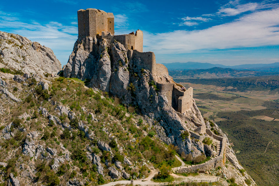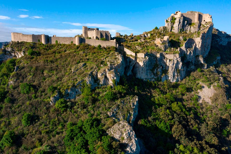 Les châteaux abusivement dits « cathares » de Lastours (page précédente), Peyrepertuse (ci-dessus) et de Quéribus (à droite) :