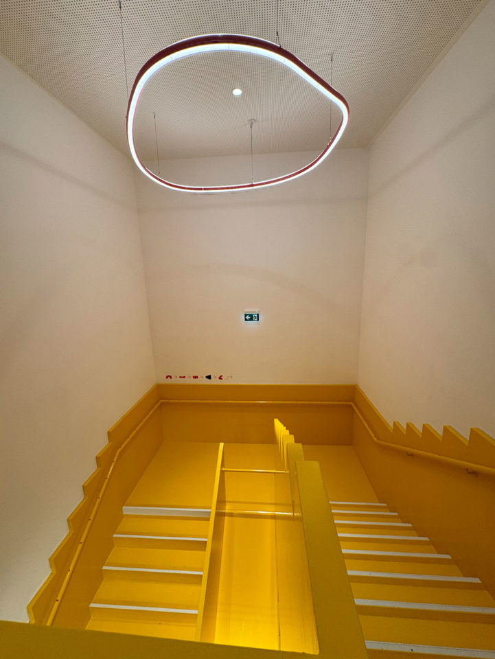 En charge du projet, l’architecte designer et plasticienne Sarah Gouy a souhaité, dès l’entrée, éveiller les sens, faire ressentir l’espace, les contrastes visuels, les ambiances sonores, « jouant sur les contraintes du lieu (façade aveugle, réverbération sonore, deux niveaux…) tout en encourageant la circulation libre et l’exploration sensorielle ». Le sol souple et coloré répond aux couleurs primaires structurant l’espace ; les luminaires, tout en légèreté, prennent la forme de hula-hoop ; l’escalier jaune vif doté d’un toboggan et la banque d’accueil cannelée rendent hommage aux codes du Catalan Ricardo Bofill (le concepteur du quartier Antigone), tandis que le mélange de matériaux – bois, métal, mosaïque ou encore textile – invite au toucher. « Avec ses ambiances chromatiques formelles qui peuvent tout aussi bien évoquer la mer, les nuages, la plage…, mille formes ouvre le champ des possibles et stimule l’imaginaire des enfants », exprime l’architecte designer, qui réalise d’ailleurs de nombreux projets avec et pour les enfants. « À la différence d’autres centres d’art, nous avons privilégié les dispositifs immersifs pour que l’enfant soit auteur des gestes ; ici, il est interdit de ne pas toucher », complète fièrement la directrice du lieu, Lydie Marchi.