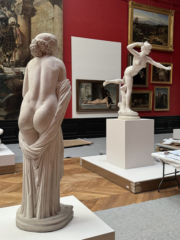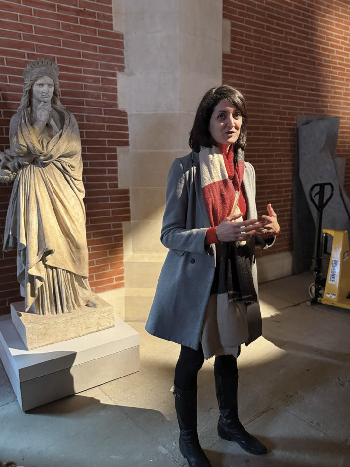 Dans ces escaliers seront présentées des œuvres des XIXe et XXe siècles. La chorégraphie des sculptures qui semblent se répondre l’une à l’autre joue avec l’espace non sans une certaine espièglerie, indifférentes aux allées et venues incessantes des techniciens qui s’activent avant la réouverture. Ici on apprête les socles et les vitrines tandis qu’un chariot élévateur aide à libérer de sa caisse Le Génie de Toulouse, signée du sculpteur toulousain Carlo Sarrabezolles (1888-1971). Récemment acquise par la Ville, elle sera installée dans la plus vaste des quatre vitrines de la boutique, donnant sur la rue de Metz.
