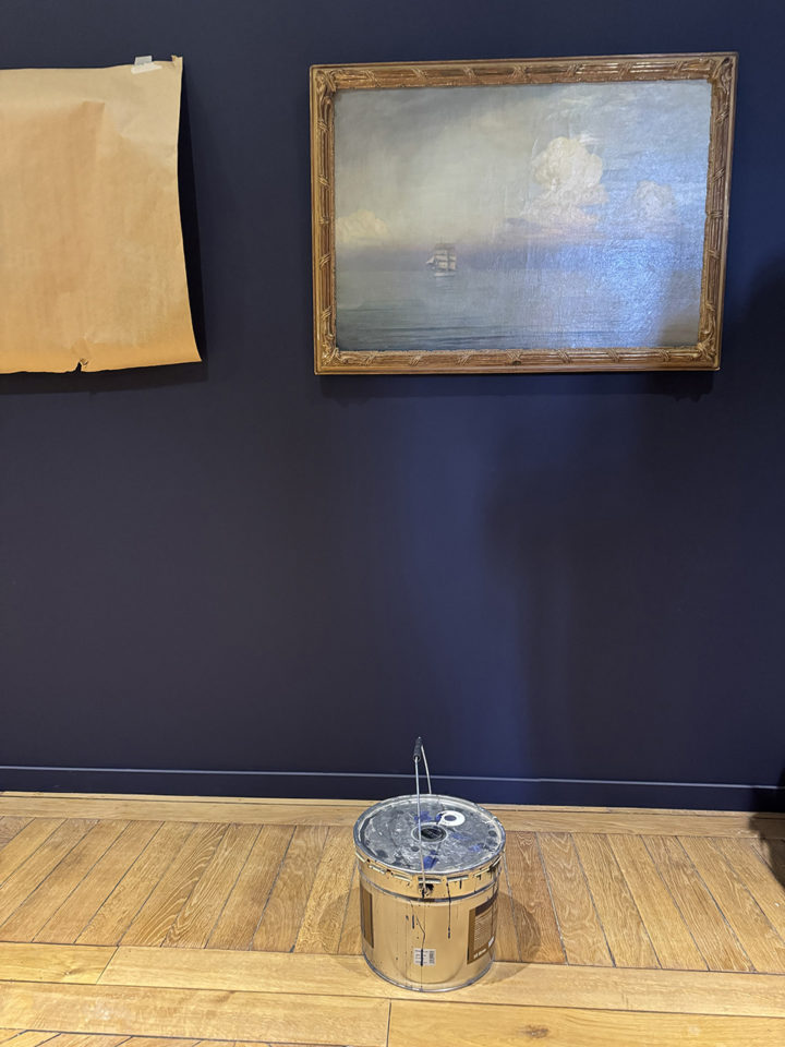 3 – Un pot de peinture, au pied de Temps calme, d’Émile-René Menard, est toutefois prétexte à rappeler avec humour que les travaux ont été mis à profit d’une campagne de restauration de nombreuses œuvres.